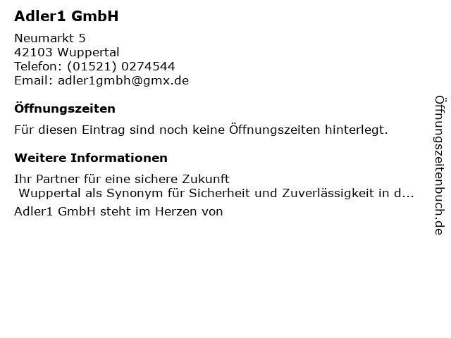 | Öffnungszeiten Adler1 GmbH in Wuppertal anzeigen | |