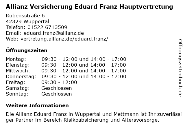 1 Allianz Versicherung Bahittin Akyazi Hauptvertretung (Entfernung: 0,00 km) Rubensstraße 6, 42329 Wuppertal 6 |