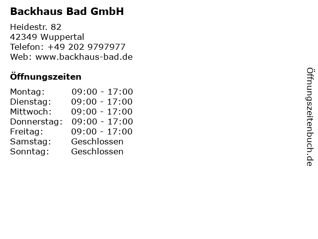 | Öffnungszeiten Backhaus Bad GmbH in Wuppertal anzeigen | |