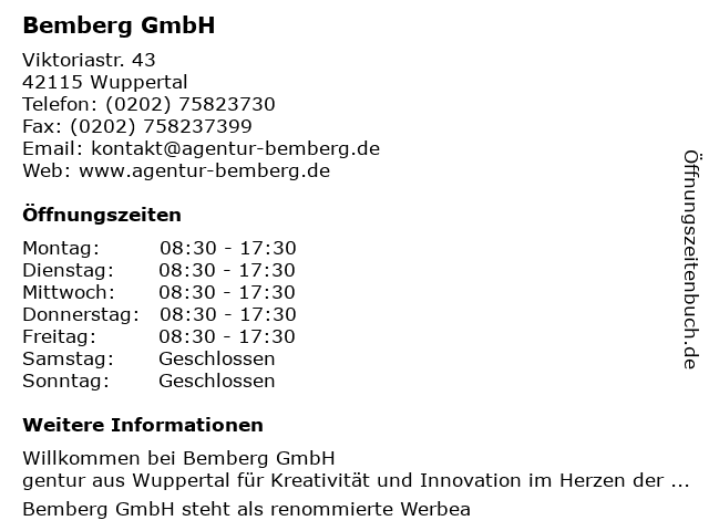 | Öffnungszeiten Bemberg GmbH in Wuppertal anzeigen | |
