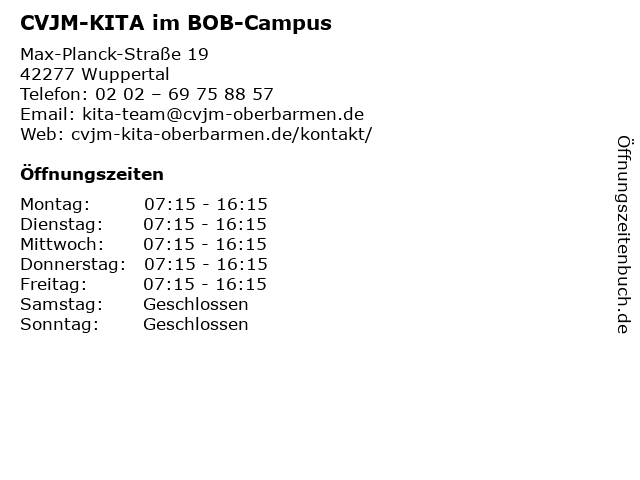 | Öffnungszeiten CVJM-KITA im BOB-Campus in Wuppertal anzeigen | |