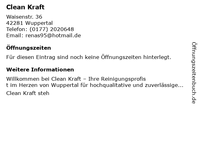 | Öffnungszeiten Clean Kraft in Wuppertal anzeigen | |