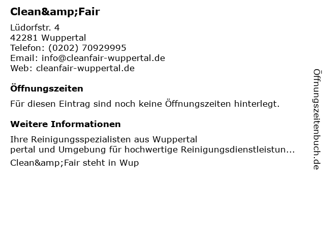 | Öffnungszeiten Clean&Fair in Wuppertal anzeigen | |