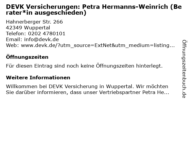 | DEVK Versicherungen: Petra Hermanns-Weinrich (Berater*in ausgeschieden) anrufen | |