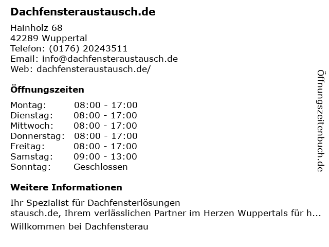 | Öffnungszeiten Dachfensteraustausch.de in Wuppertal anzeigen | |