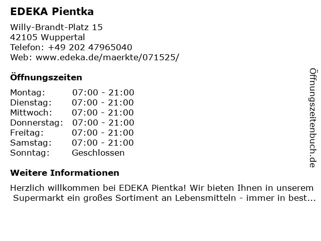 | Öffnungszeiten EDEKA Pientka in Wuppertal anzeigen | |