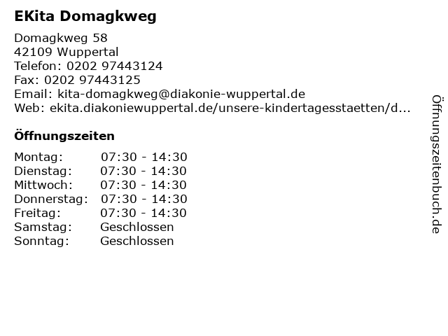 | Öffnungszeiten EKita Domagkweg in Wuppertal anzeigen | |