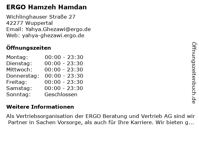 | Öffnungszeiten ERGO Hamzeh Hamdan in Wuppertal anzeigen | |
