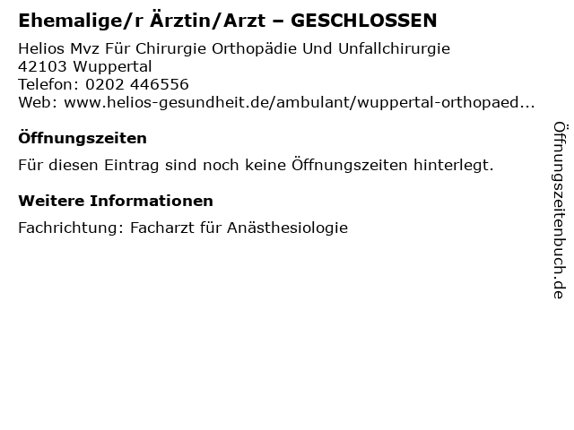 1 Ehemalige/r Ärztin/Arzt – GESCHLOSSEN (Entfernung: 2,78 km) Helios Mvz Dgu Die Gesundheitsunion , 42283 Wuppertal 2 Ehemalige/r Ärztin/Arzt – GESCHLOSSEN (Entfernung: 3,93 km) Orthopädisch-chirurgisches Centrum Wuppertal Occ , 42275 Wuppertal 3 Ehemalige/r Ärztin/Arzt – GESCHLOSSEN (Entfernung: 3,93 km) Orthopädisch-chirurgisches Centrum Wuppertal Occ , 42275 Wuppertal 4 Ehemalige/r Ärztin/Arzt – GESCHLOSSEN (Entfernung: 3,93 km) Orthopädisch-chirurgisches Centrum Wuppertal Occ , 42275 Wuppertal 5 Ehemalige/r Ärztin/Arzt – GESCHLOSSEN (Entfernung: 4,91 km) Helios Mvz Dgu Die Gesundheitsunion Gmbh , 42275 Wuppertal 6 Ehemalige/r Ärztin/Arzt – GESCHLOSSEN (Entfernung: 8,64 km) Helios Mvz Chirurgie Remscheid Trägerschaft Mvz Dgu Die Gesundheitsunion , 42853 Remscheid |