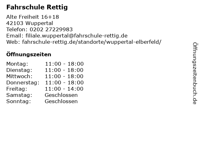 | Öffnungszeiten Fahrschule Rettig in Wuppertal anzeigen | |