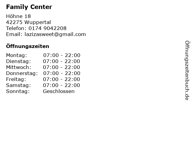 | Öffnungszeiten Family Center in Wuppertal anzeigen | |
