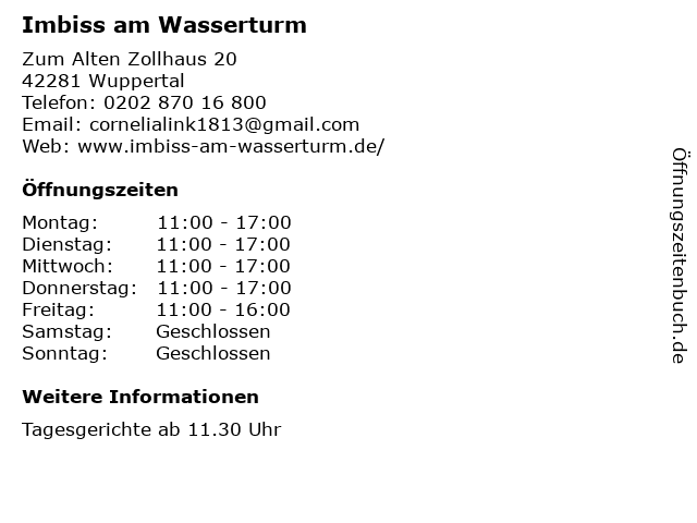 | Öffnungszeiten Imbiss am Wasserturm in Wuppertal anzeigen | |