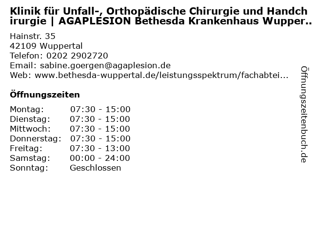1 Klinik für Neurochirurgie am AGAPLESION BETHESDA KRANKENHAUS WUPPERTAL (Entfernung: 0,00 km) Hainstr. 35, 42109 Wuppertal 2 Klinik für Neurologie am AGAPLESION BETHESDA KRANKENHAUS WUPPERTAL (Entfernung: 0,00 km) Hainstr. 35, 42109 Wuppertal 3 Klinik für Frauenheilkunde und Geburtshilfe am AGAPLESION BETHESDA KRANKENHAUS WUPPERTAL (Entfernung: 0,00 km) Hainstr. 35, 42109 Wuppertal 4 Klinik für Allgemein-, Viszeral- und Gefäßchirurgie (Entfernung: 0,00 km) Hainstr. 35, 42109 Wuppertal 6 |