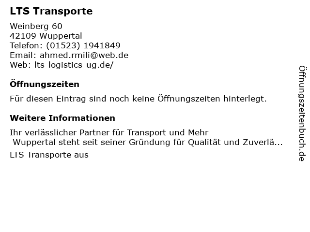 | Öffnungszeiten LTS Transporte in Wuppertal anzeigen | |