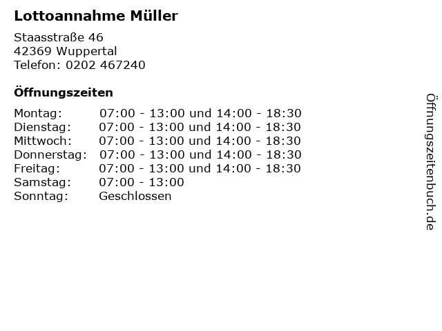 | Öffnungszeiten Lottoannahme Müller in Wuppertal anzeigen | |