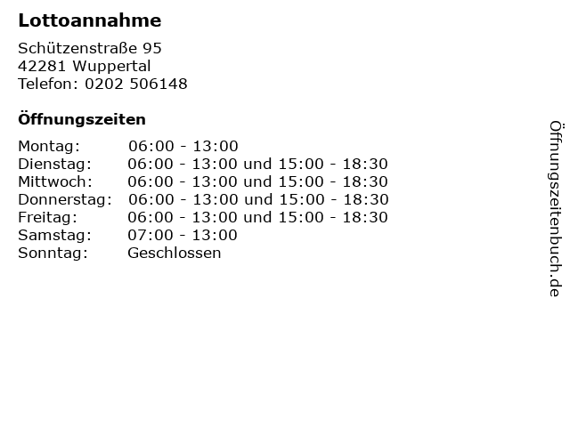 | Öffnungszeiten Lottoannahme in Wuppertal anzeigen | |