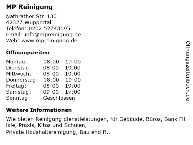 | Öffnungszeiten MP Reinigung in Wuppertal anzeigen | |