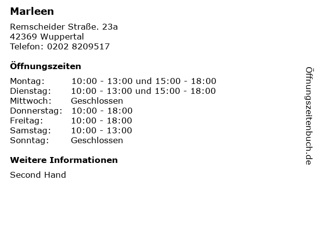 | Öffnungszeiten Marleen in Wuppertal anzeigen | |