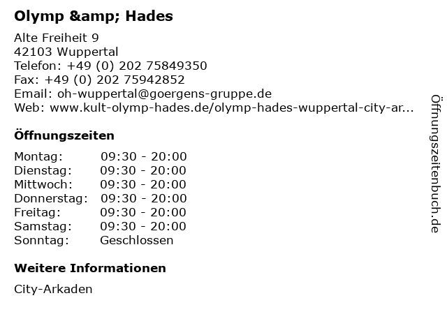 | Öffnungszeiten Olymp & Hades in Wuppertal anzeigen | |
