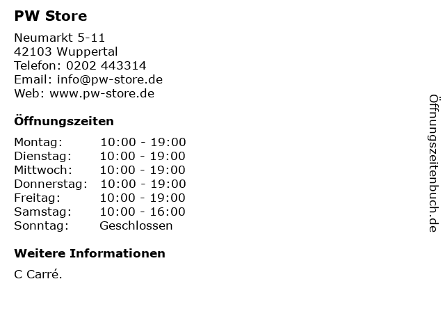 | Öffnungszeiten PW Store in Wuppertal anzeigen | |