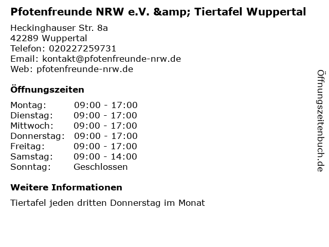 Branchen & Suchbegriffe zu Pfotenfreunde NRW e.V. & Tiertafel Wuppertal:e.v., katzenvermittlung, nassfutter, nordrhein westfalen, nrw, nrw.de, pflegestelle, pfotenfreunde, sachspende, spende, tierfutter kostenlos, tierheim, tierschutz, tierschutzorganisation, tierschutzverein, tiertafel, tiervermittlung, trockenfutter |