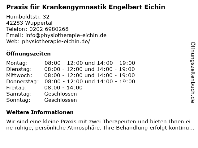 4 Praxis für Krankengymnastik und Physiotherapie Rainer Huter (Entfernung: 2,47 km) Lentzestr 54, 42277 Wuppertal 6 |