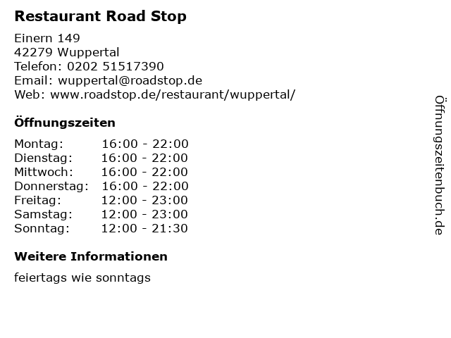 Öffnungszeiten Restaurant Road Stop in Wuppertal anzeigen | |