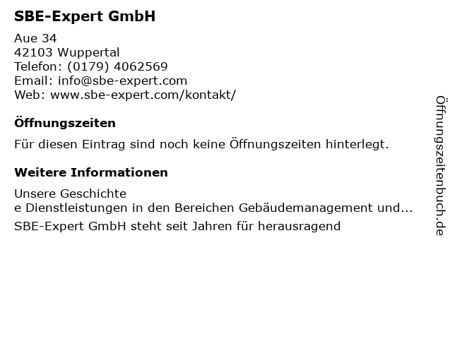 | Öffnungszeiten SBE-Expert GmbH in Wuppertal anzeigen | |