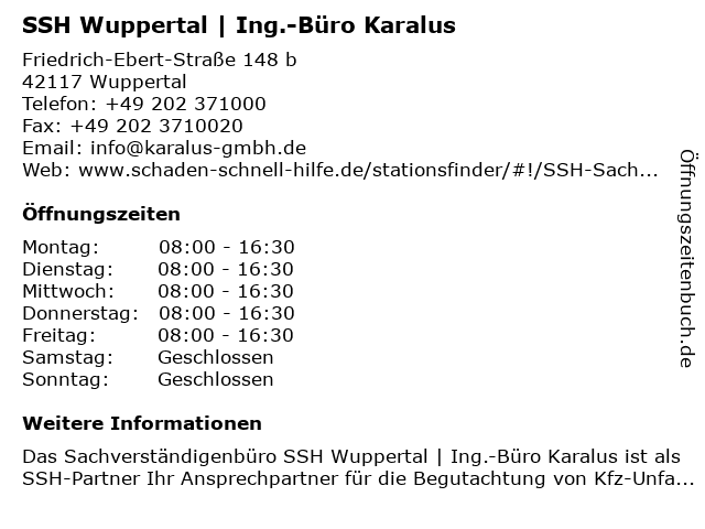 2 Karalus GmbH, Bleckmann Frank Dipl.-Ing., öffentl. best. u. vereid. Kfz-Sachverständiger (Entfernung: 0,02 km) Friedrich-Ebert-Str. 146, 42103 Wuppertal 3 SSH Düsseldorf | GTÜ, IFM Kfz-Sachverständige (Entfernung: 21,55 km) Königsberger Straße 10, 40231 Düsseldorf 6 |