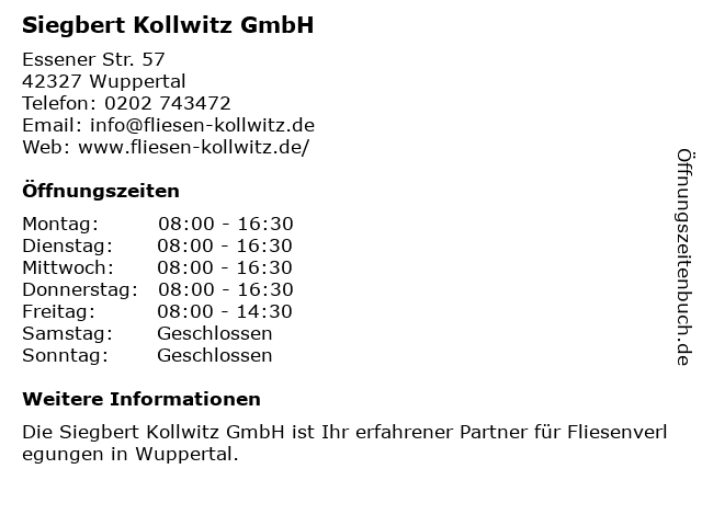 | Öffnungszeiten Siegbert Kollwitz GmbH in Wuppertal anzeigen | |