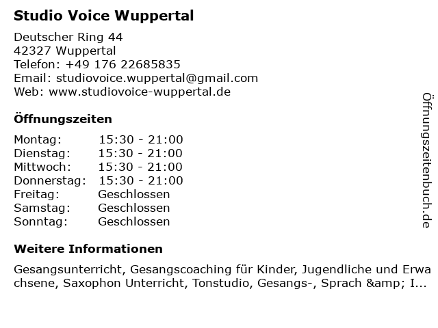 | Öffnungszeiten Studio Voice Wuppertal in Wuppertal anzeigen | |