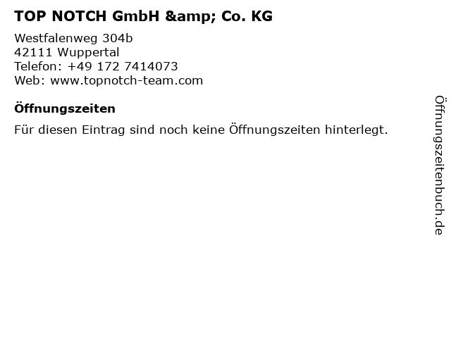 | Öffnungszeiten TOP NOTCH GmbH & Co. KG in Wuppertal anzeigen | |