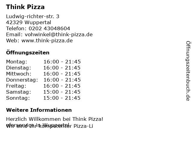 | Öffnungszeiten Think Pizza in Wuppertal anzeigen | |