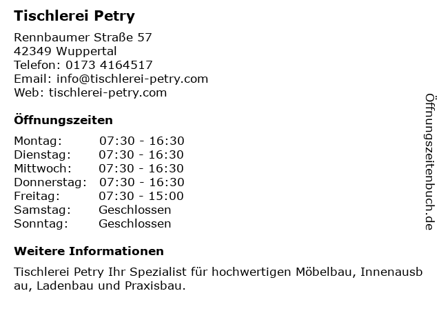 | Öffnungszeiten Tischlerei Petry in Wuppertal anzeigen | |