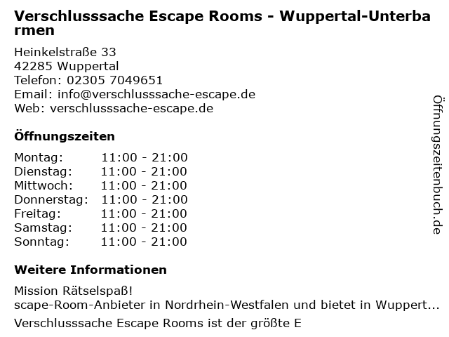 Branchen & Suchbegriffe zu Verschlusssache Escape Rooms - Wuppertal-Unterbarmen:escape, rooms, unterbarmen, verschlusssache |