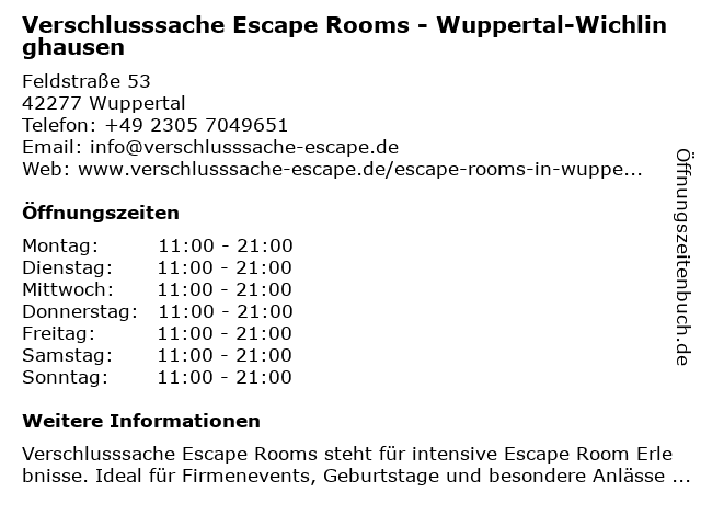 1 Verschlusssache Wuppertal - Escape Rooms - Standort Wichlinghausen (Entfernung: 0,00 km) Feldstraße 53, 42277 Wuppertal 4 Evang. Kirchengemeinde Wichlinghausen-Nächstebreck (Entfernung: 0,32 km) Westkotter Str. 177, 42277 Wuppertal 6 |