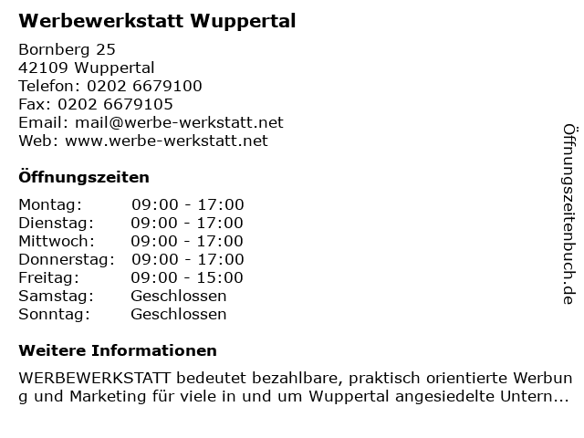 | Öffnungszeiten Werbewerkstatt Wuppertal in Wuppertal anzeigen | |