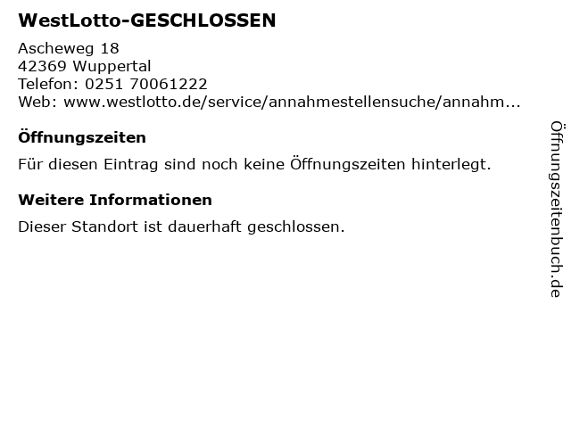 | Adresse WestLotto-GESCHLOSSEN in Wuppertal anzeigen |
