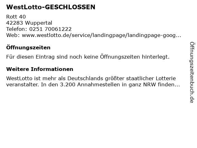 | Öffnungszeiten WestLotto-GESCHLOSSEN in Wuppertal anzeigen | |