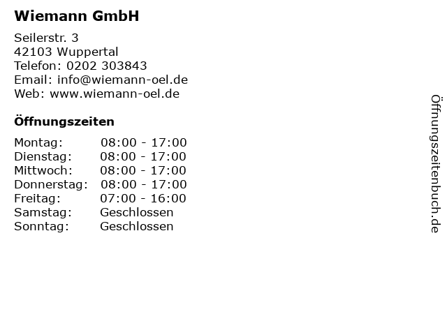 | Öffnungszeiten Wiemann GmbH in Wuppertal anzeigen | |