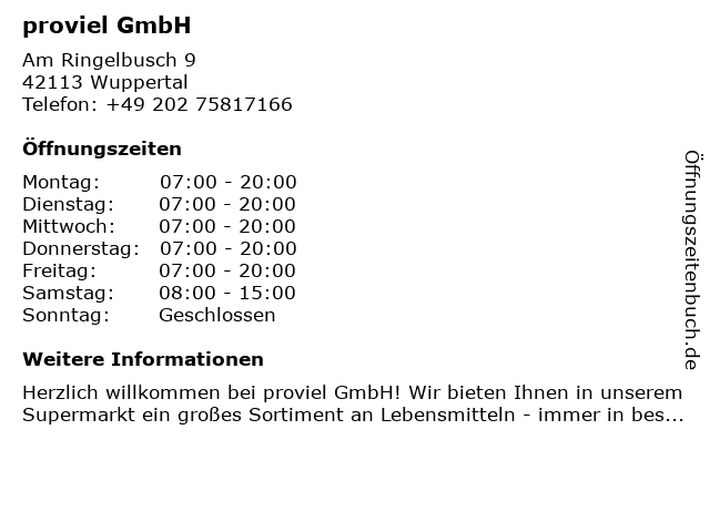 | Öffnungszeiten proviel GmbH in Wuppertal anzeigen | |