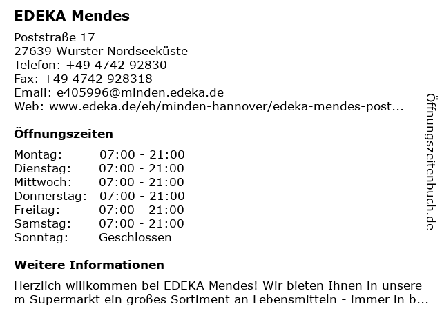 | Öffnungszeiten EDEKA Mendes in Wurster Nordseeküste anzeigen | |