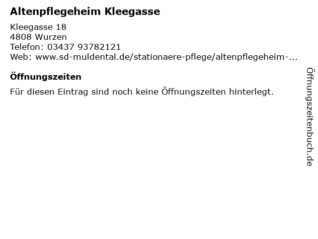 | Öffnungszeiten Altenpflegeheim Kleegasse in Wurzen anzeigen | |