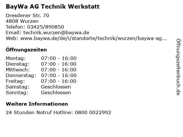 | Öffnungszeiten BayWa AG Technik Werkstatt in Wurzen anzeigen | |