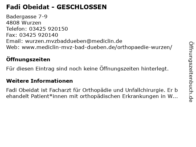 | Telefonnummer Fadi Obeidat - GESCHLOSSEN in Wurzen (03425 920150) anrufen | |