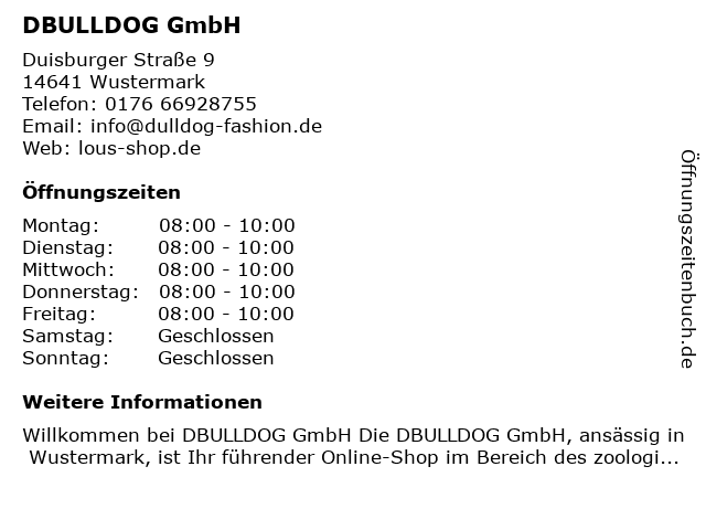 | Öffnungszeiten DBULLDOG GmbH in Wustermark anzeigen | |
