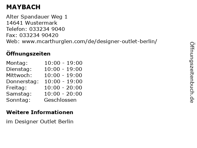 | Öffnungszeiten MAYBACH in Wustermark anzeigen | |