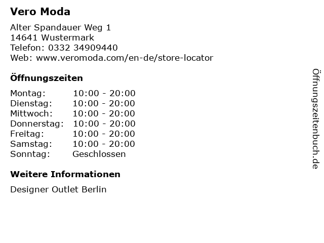 | Öffnungszeiten Vero Moda in Wustermark anzeigen | |