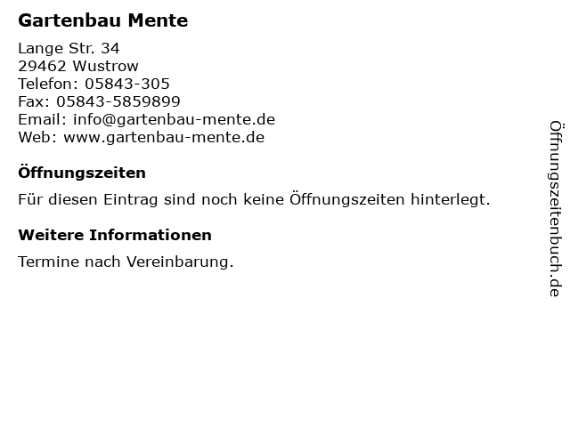 | Öffnungszeiten Gartenbau Mente in Wustrow anzeigen | |