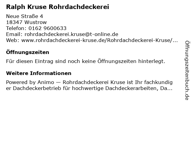 | Öffnungszeiten Ralph Kruse Rohrdachdeckerei in Wustrow anzeigen | |